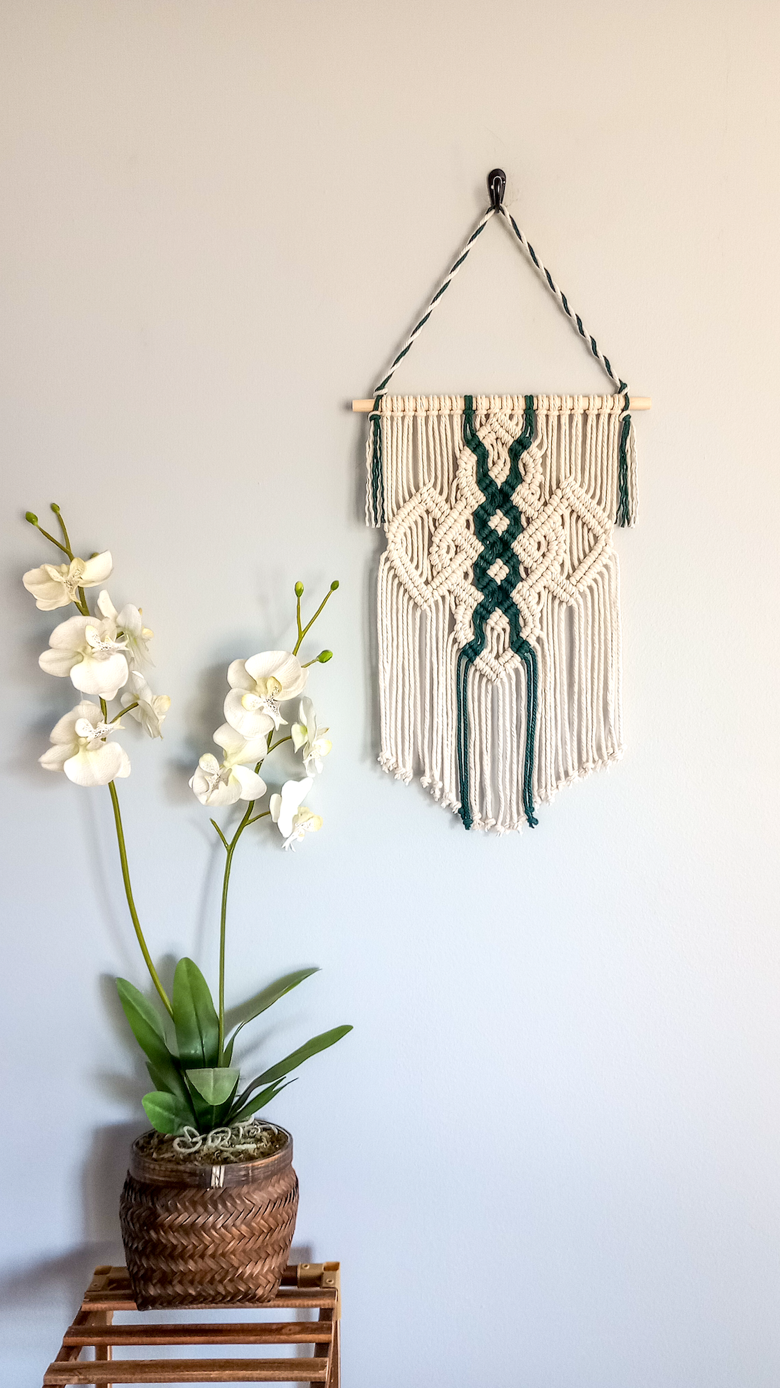 This is a beautiful, traditional Celtic Knot Macramé Wall hanging in natural (off white) and deep forest green with a wood dowel in a compact size. The macramé is 100% premium natural cotton.
