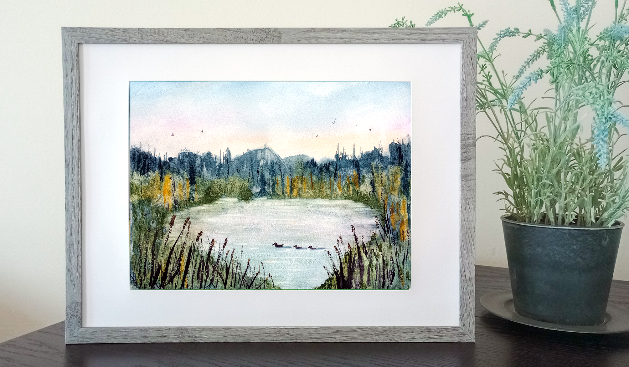 This is an original painting (NOT A PRINT OR COPY) titled "Pond Pals". The style is "atmospheric" with ducks swimming and birds flying across a serene wooded pond. This signed piece was painted by me on 140lb. Saunders Waterford 100% cotton watercolor paper using Daniel Smith professional watercolor paints.